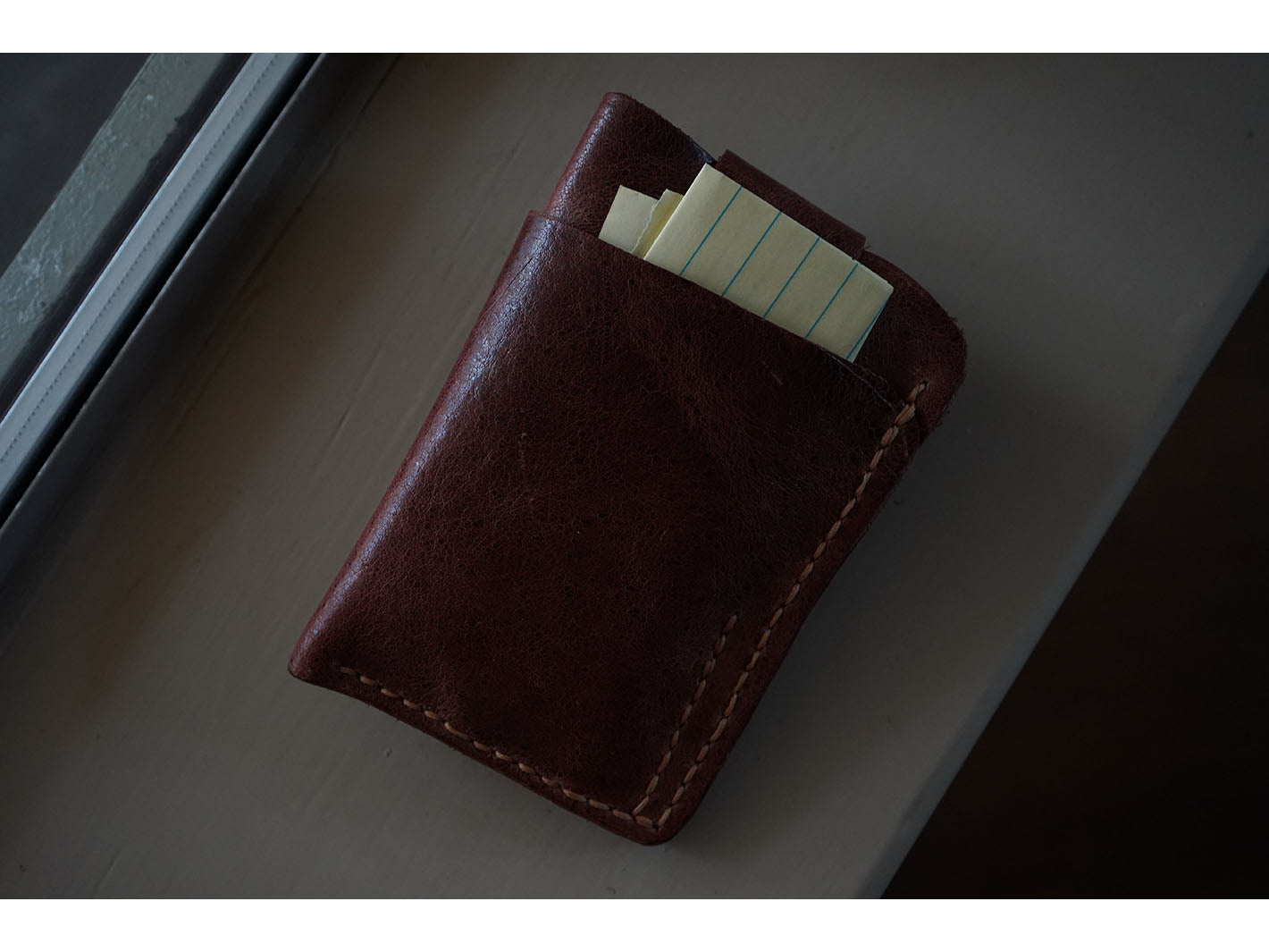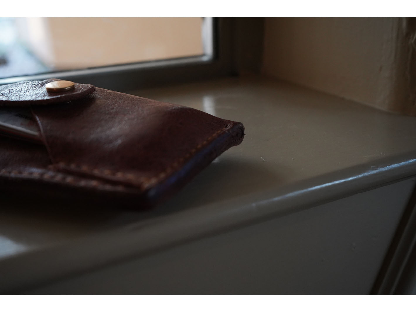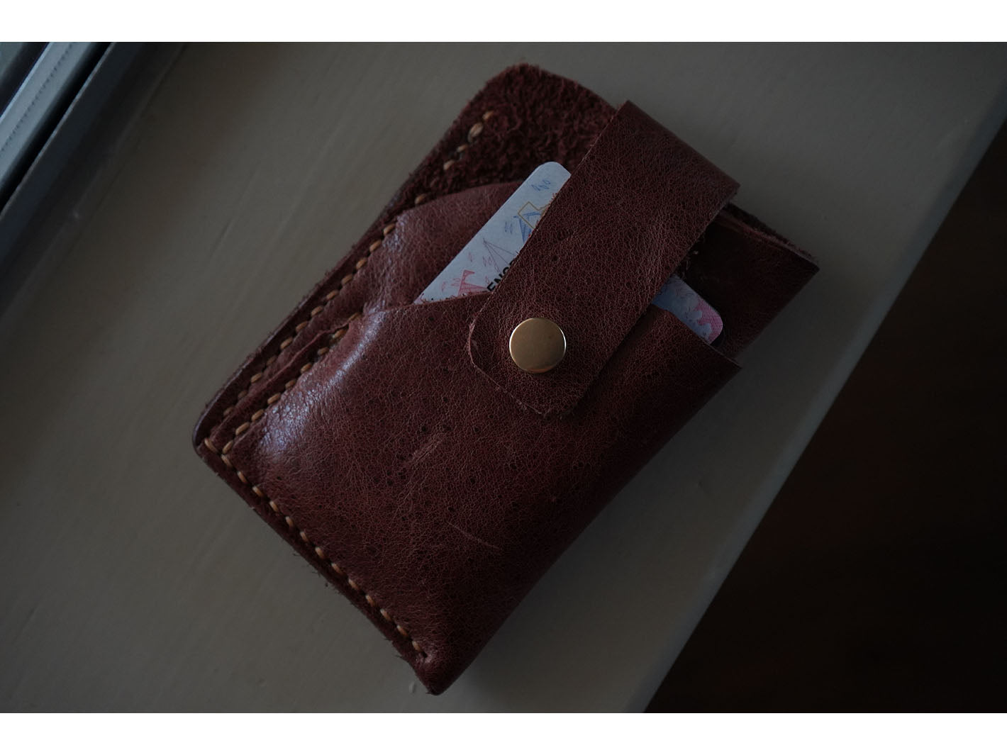 This prototype wallet is one of the first design iterations, complete with a snap and three pockets for cash and notes.